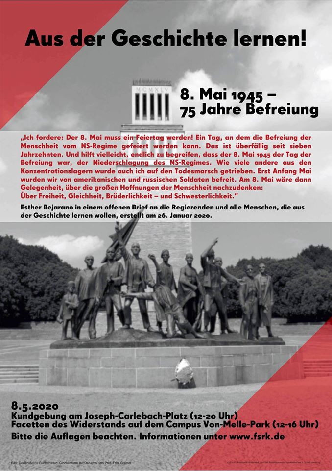 Eine ganztägige Kundgebung auf dem Carlebach-Platz ist angemeldet und wird unter Auflagen möglich sein. Wir sind bemüht, dass alle Interessierten vor Ort an der geplanten Gedenklesung (12-16 Uhr), Podiumsdiskussion um die von Esther Bejarano erneuerten Forderung, den 8. Mai zum Feiertag zu machen (16-18 Uhr) sowie musikalischen Beiträgen (18-20 Uhr) teilnehmen können. Da aber von einer Beschränkung der Teilnehmer*innenzahl auszugehen ist, bitten wir Euch, vor Ort auf diesbezügliche Hinweise zu achten, damit die Kundgebung auch unter den gegebenen Umständen stattfinden kann. Die Maßgaben für die Kundgebung und weitere Informationen findet ihr unter https://www.fsrk.de/ – auch über eine mögliche Videoübertragung.Unser Vorhaben ist darüber hinaus ein „Weg des Widerstands“ über den Campus (12-16 Uhr). Auf diesem sollen antifaschistisch Aktive aus den verschiedensten Bereichen (Geschichtswerkstätten, Fachschaftsräte, Gewerkschaften, Friedensbewegung) an Infotischen mit (abstandhaltenden) Interessierten ins Gespräch kommen können, welche Konsequenzen sie aus der Befreiung 1945 ziehen.Ihr findet uns mit einem Stand auf dem „Weg des Widerstands“ vor der ehem. HWP, um über den antifaschistischen Gehalt der Gründung unserer Vorgängerinstitution der Akademie für Gemeinwirtschaft (AfG) und den dafür zugrundeliegenden sozialökonomischen Konsequenzen aus dem Faschismus zu diskutieren und Konsequenzen für heute zu beraten.