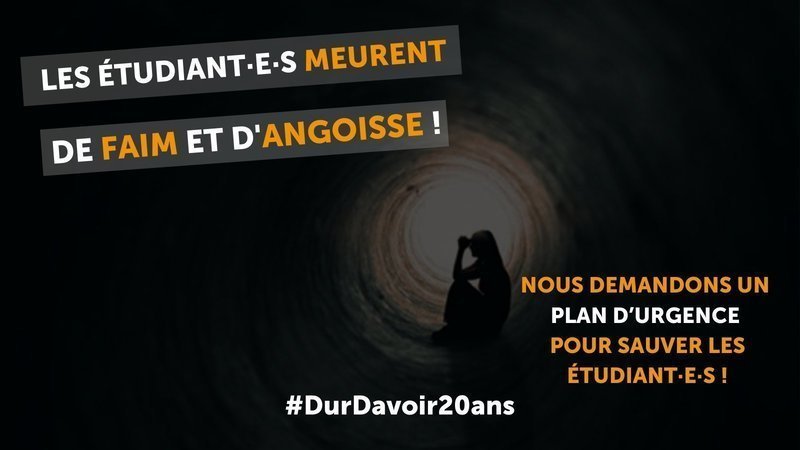 Nous n’en pouvons plus. Un nombre croissant d’entre nous tentent et, malheureusement, parfois réussissent à se suicider, tellement la situation que vous nous imposez est intenable. Notre détresse est immense. On ne compte plus le nombre d’étudiant·e·s qui doivent sauter des repas pour survivre, qui coupent leur chauffage en plein hiver pour faire des économies, qui ne vont plus du tout chez le médecin faute d’argent.