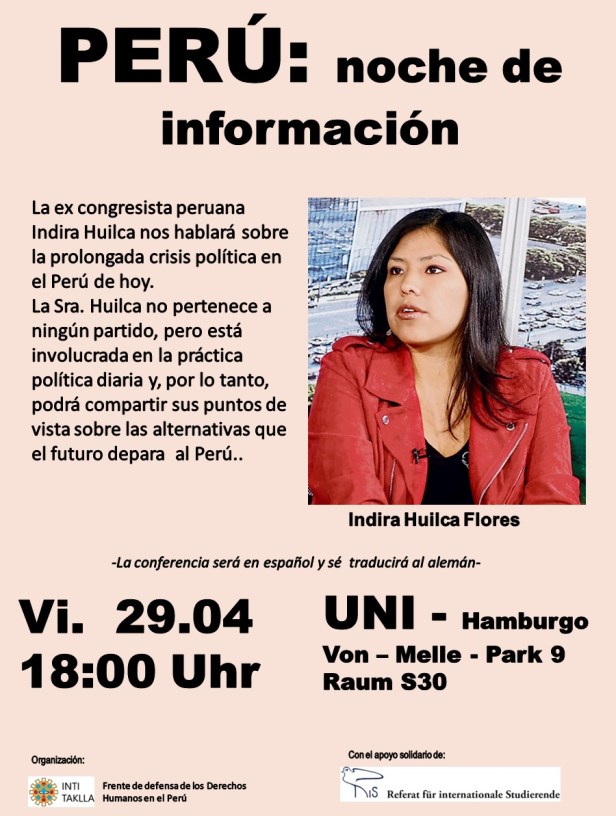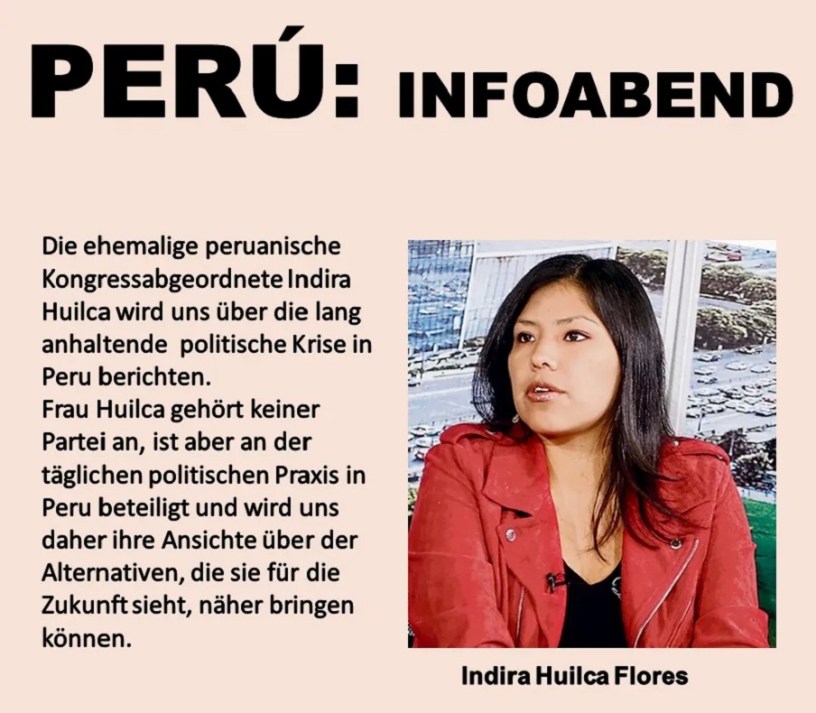 Die ehemalige peruanische Kongressabgeordnete Indira Huilka Flores wird uns über die lang anhaltende politische Kriese in Peru berichten. Frau Huilca gehört keine Partei an, ist aber an der täglichen politischen Praxis in Peru beteiligt und wird uns daher ihre Ansichten über die Alternative, die sie für die Zukunft sieht, näher bringen können.