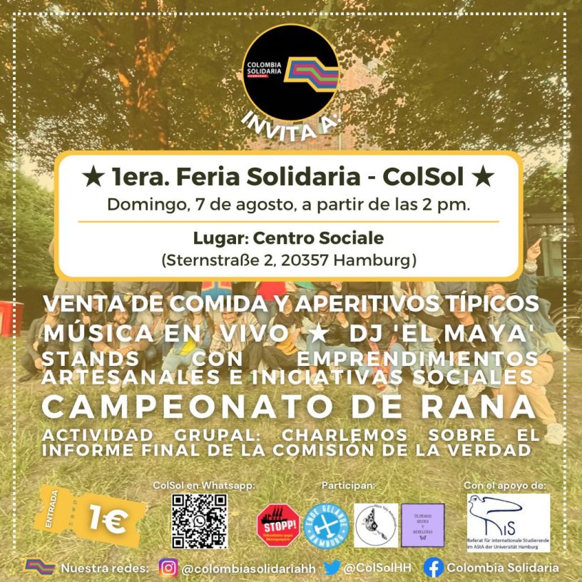 Am 7. August (Sonntag) lädt Colombia Solidaria alle zu dem ersten Soli-Fest ein! Die Gruppe berichtet über den Konflikt in Kolumbien und stellt den Bericht der Wahrheitskommission darüber dar. Unter anderem erwartet Euch kolumbianisches Essen, Live Musik, Dj, kunsthandwerkliche Stände und verschiedene soziale Initiativen!