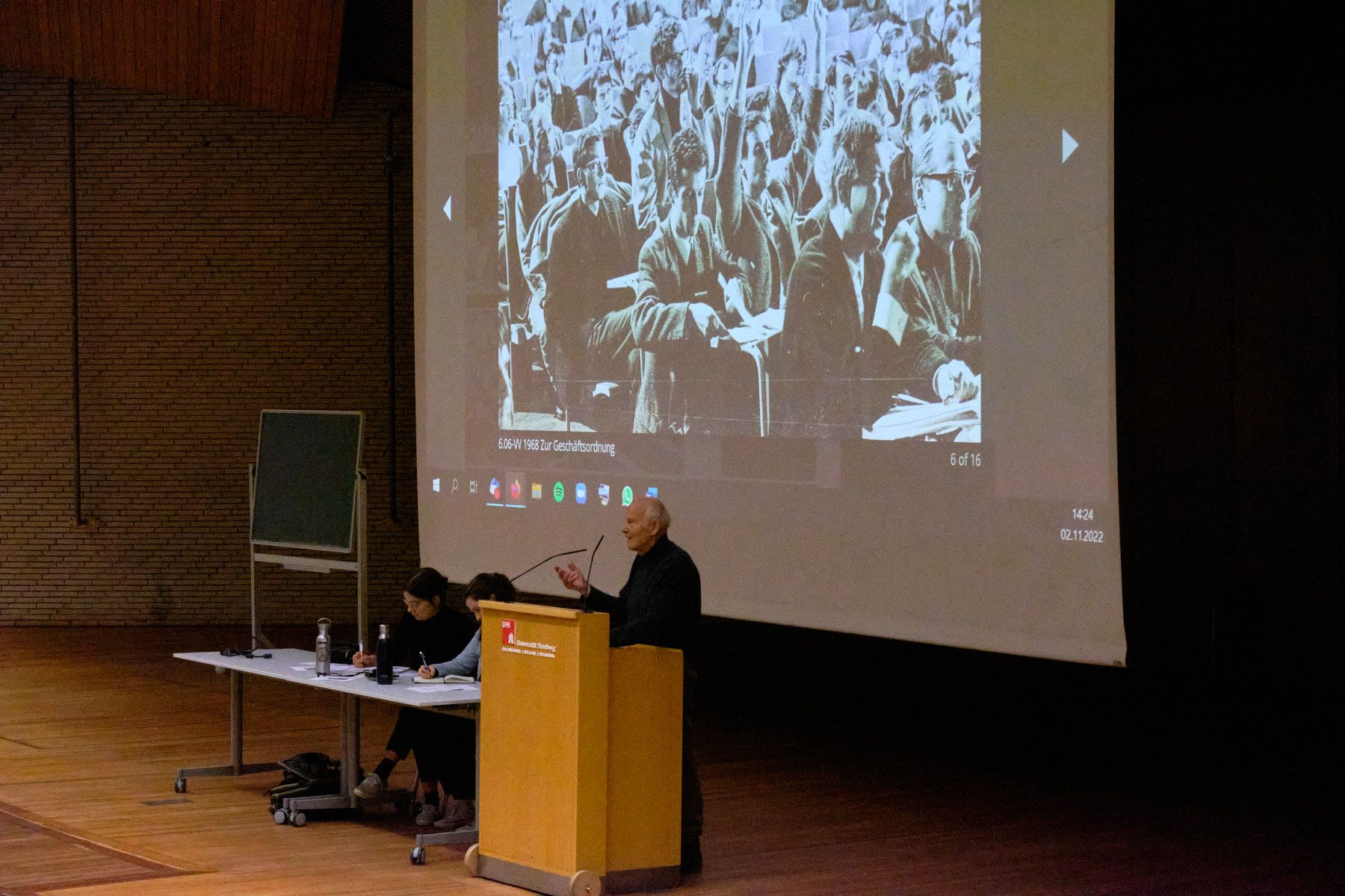 Zu Beginn überraschten ehemalige Studierende, die 1968 hier studiert haben, alle. Sie begrüßten uns alle und berichteten, welche Bedeutung Vollversammlungen für die studentische Revolte der 1960er Jahre auch in Hamburg hatte. Ihr Engagement zeigt hervor, dass aktive demokratische Patizipation und internationale Solidarität ausschlaggebend gewesen sind für große gesellschaftliche Veränderungen – von der Demokratisierung der Hochschulen und Abschaffung von Studiengebühren bis zur Beendigung des Vietnam-Krieges.