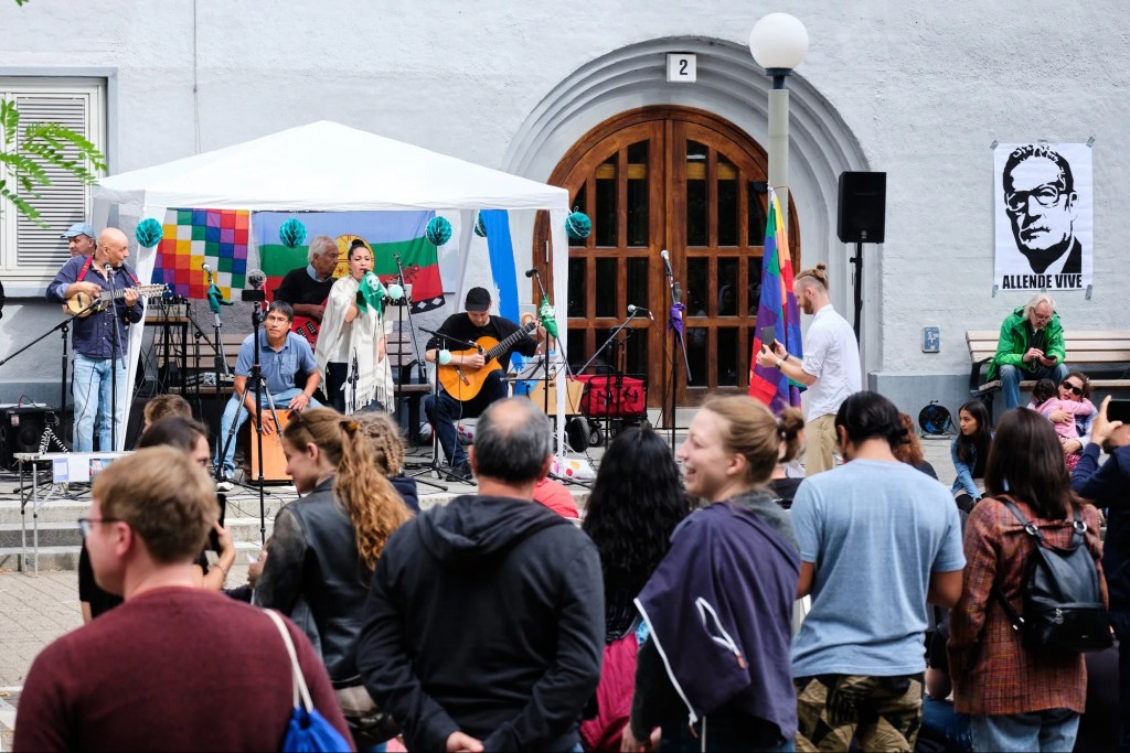 Zum Jahrestag des Putsches in Chile am 11. September 1973 haben wir eine Kundgebung auf dem neben der Uni gelegenen Allende-Platz durchgeführt, um an die historische „Unidad Popular“ zu erinnern, lateinamerikanische Studierende und Aktivist:innen in Hamburg zusammenzubringen und die Öffentlichkeit über die gegenwärtigen Aufbrüche und Konflikte Lateinamerikas und die Zusammenhänge mit europäischer Politik aufzuklären.